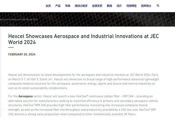 Hexcel歐洲、MEA/AP地區及工業業務總裁Thierry Merlot表示:“我們非常高興能參加2024年的JEC世界博覽會,展示我們的最新創新成果,并慶祝我們的客戶在使用Hexcel材料取得的成功。JEC為我們提供了一個無與倫比的平臺,讓我們能夠與行業領導者互動,建立戰略合作關系,并證明我們在塑造這個動態且不斷演進的全球市場中輕質復合材料未來發展方面的堅定承諾。”