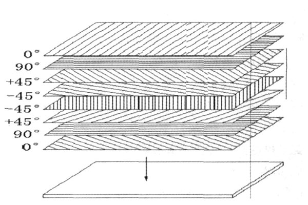 在準各向碳纖維層壓板的鋪層上面,常采用的鋪層方向是0°、90°、+45°和-45°這樣的鋪層角度,實際生產中,會根據生產碳纖維層壓板的厚度進行調整,但至少是要有八分之一的鋪層是要在這個四個方向上。