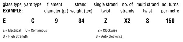 玻璃纖維的國際的工人術語是E = Electrical/電氣的,C = Continuous/連續的,Z = Clockwise/順時針的,S = High Strength /高強度的,S = Anti- clockwise/逆時針的方式表示。