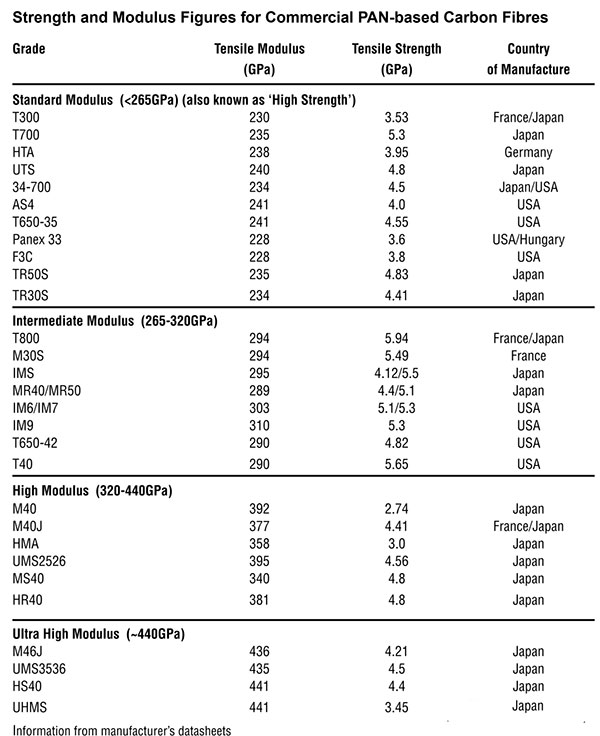 碳纖維通常被標注:高強度(HS),中等模量(IM),高模量(HM)和超高模量(UHM)這樣的方式來區分碳纖維性能。