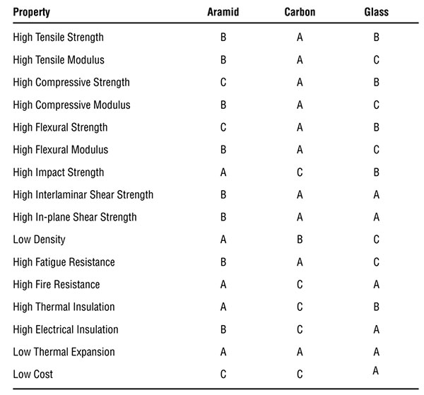 不同的纖維都有不同于的優點和缺點,也就有了不同領域中的應用的情況,下面也有關于不同纖維類型在不同應用中的得分情況。“A”表示纖維得分較高的特征,“C”表示纖維得分較低的特征。