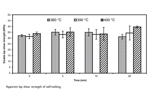 通過相對應的研究樹脂中看,將CF/PEEK廢料裁切成特定尺寸的樣本條,進行雙剪切強度測試。實驗參數包括不同溫度(380°C、390°C和400°C)和時間(3、5、10和20分鐘)下的熔融粘結。此外,還測試了不同類型的熱固性膠粘劑對粘結性能的影響,包括帶有催化劑的mdi膠和層壓環氧樹脂。